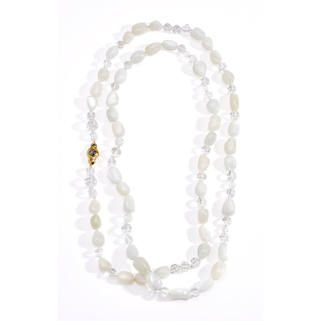 Grey moonstone, rose cut brown diamonds, rose-hued sunstone, dendritic agate, 18k yellow gold.